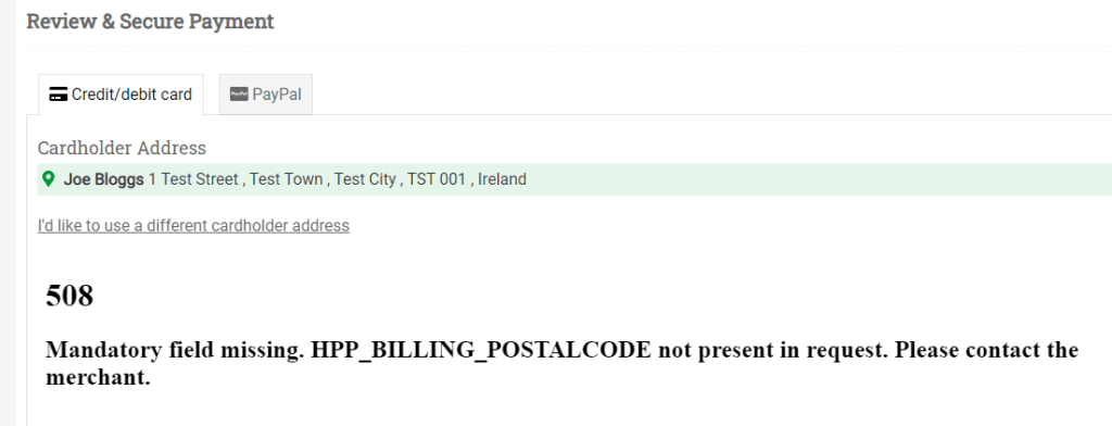 However, we have not tested these for every different live environment scenario (e.g. orders from foreign countries, etc) and the user could be shown an error like the following on the checkout screen which will not make too much sense for them in that they may not be able to understand that they have to click “I’d like to use a different cardholder address” and then enter a post-code. So please look out for these issues reported by customers and send them through to the Help Desk for us to try and fix them. Our approach for fixes to these scenarios is to try and catch these validation errors earlier in the checkout process when they are being entered by the user.